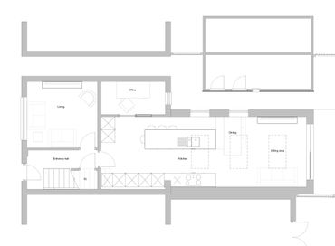Murtagh Studio undertook the transformation of a mid-terraced home to accommodate a young family expecting their second child. The project involved a single-storey rear extension and a reconfiguration of the ground floor to create an open-plan living and office space. Given the confined terraced plot, the design aimed to maximise space by reconfiguring the ground floor and improving circulation throughout the home. Large glazed openings enhance the connection to the garden, while strategic layout modifications create a clear sightline from the entrance through to the rear.