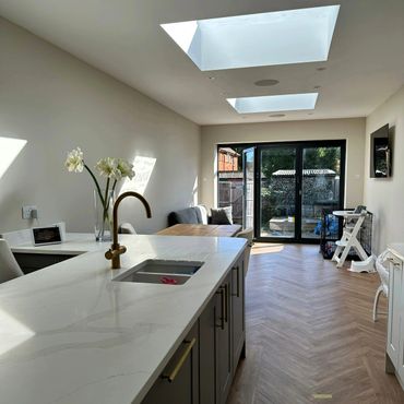 Additionally, the introduction of thoughtful lighting design and subtle material contrasts adds depth and character to the interiors. The kitchen area, positioned at the heart of the home, fosters a strong connection between living and working zones while offering a social space for the family. The extension and layout reconfiguration have transformed the home into a functional yet beautifully designed space, supporting the evolving needs of the growing family.