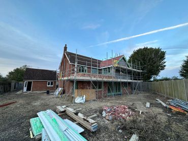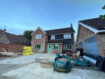 A comprehensive renovation and extension enhance connectivity, natural light, and spatial efficiency. The project wrapped the existing red brick house and new first-floor extension in contemporary cladding, giving the home a necessary kerb appeal uplift while blending with the local vernacular. The ground-floor extension creates an expansive kitchen-dining-sitting area, while a dedicated utility/boot room and pantry cater to family needs. The first-floor extension provides scenic views over the large garden and countryside for the principal bedroom, which now includes an ensuite and walk-in wardrobe.